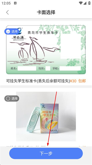 3、在卡面選擇頁面選定青島市學生乘車卡樣式,確認該卡的相關說明,點擊頁面底部的下一步按鈕,進入申請人信息填寫頁面。