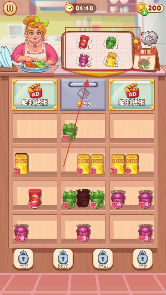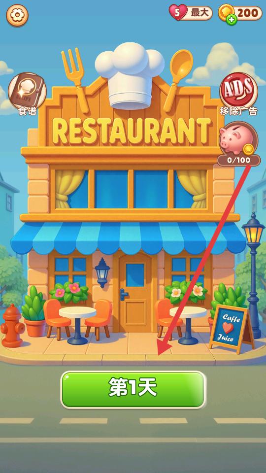 1、進入食趣消消廚游戲點擊下方的第1天按鈕,即可從初始界面進入第一天的游戲場景,開啟餐廳材料收集與經營的挑戰。