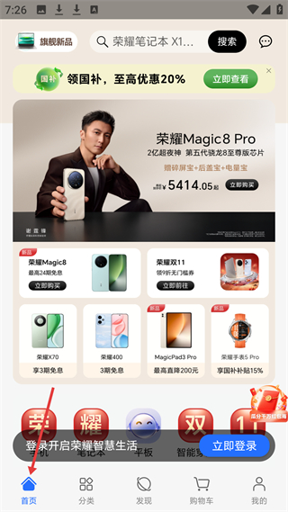 1、首頁有搜索欄,榮耀Magic8 Pro促銷banner,展榮耀Magic4等多款產品,底部有首頁等功能入口,提示登錄開啟智慧生活。