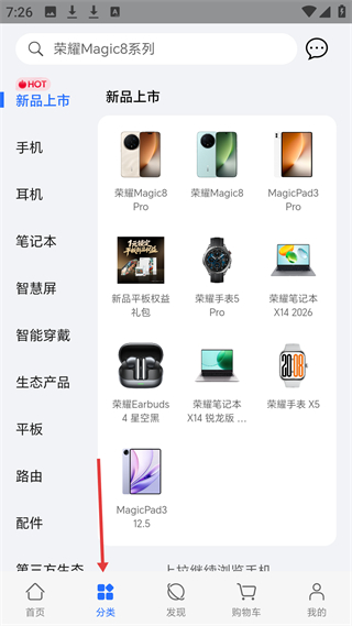 2、分類頁有新品上市板塊,分類包含手機、耳機、筆記本等,展示榮耀Magic8Pro、MagicPad3Pro等多款產品。