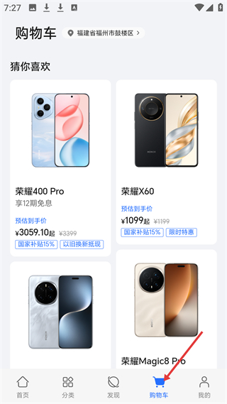 4、購物車頁,顯示猜你喜歡的榮耀手機,如榮耀400Pro、榮耀X60、榮耀Magic8Pro等,標注價格和優惠信息,底部有功能入口。