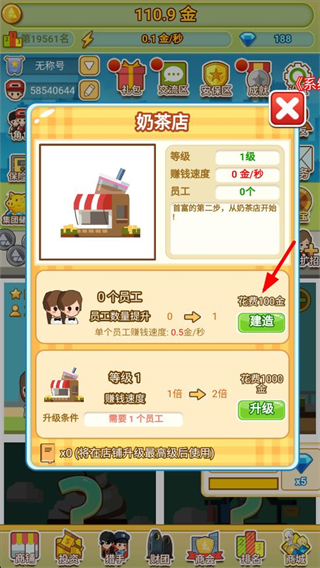 2、建造奶茶店不同類型的店鋪,花費相應金幣,豐富經營業務,提升整體賺錢速度,快速積累財富。