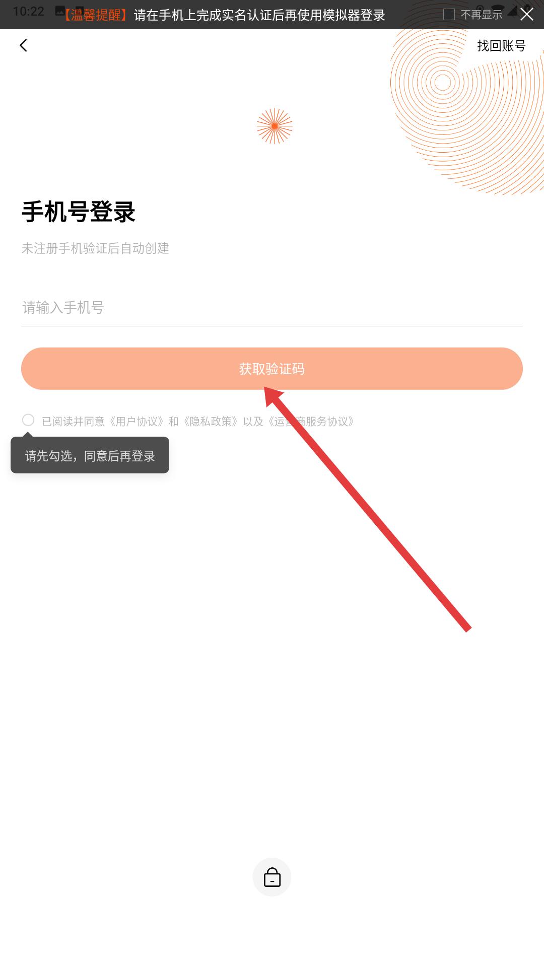 2、進入手機號登錄界面,輸入手機號并勾選同意相關協議后,點擊獲取驗證碼,完成賬號登錄操作。