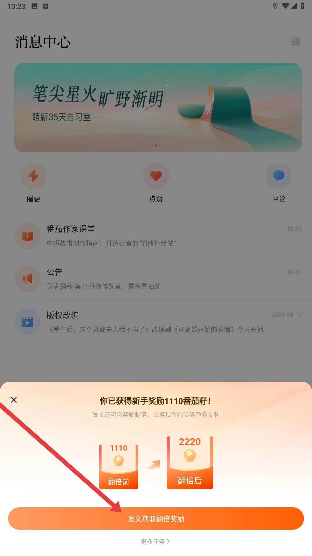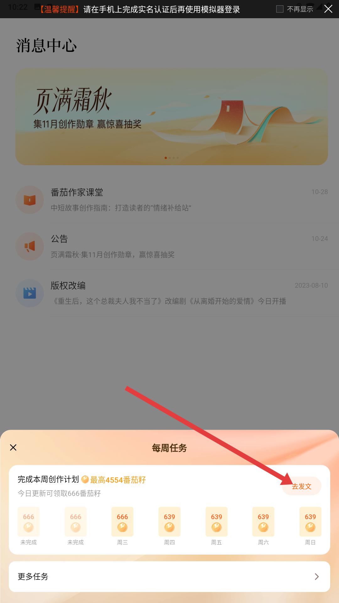 1、消息中心的每周任務彈窗中,點擊去發文可進入創作發文流程,參與創作計劃獲取番茄籽獎勵。