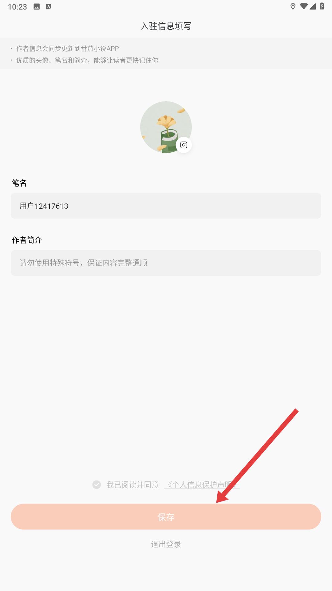 3、入駐信息填寫界面,完善頭像、筆名、作者簡介等信息后點擊保存,可完成作者入駐信息設置。
