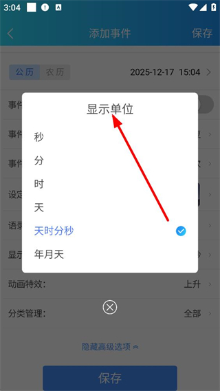 4、添加事件的高級選項中,可打開顯示單位選擇窗口,里面有秒分時天等不同時間單位選項,選擇后可設置事件倒計時的顯示單位。