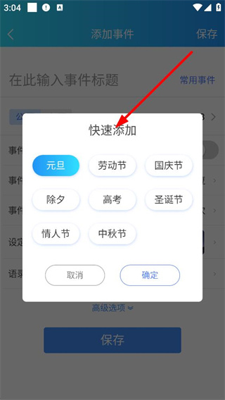 3、添加事件界面點擊常用事件,會彈出快速添加窗口,里面有元旦勞動節等預設事件選項,選擇對應選項可快速填充事件標題。