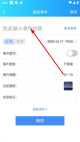 2、點擊加號按鈕后進入添加事件界面,這里有事件標題輸入框,還有公歷農歷選擇日期設置等選項,可逐步填寫事件相關信息。