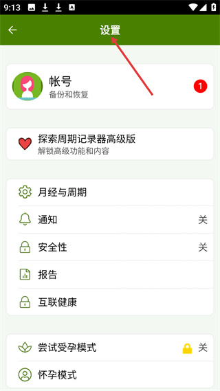 1、設置界面有帳號備份恢復、高級版解鎖等功能,還有月經與周期、通知等設置板塊,助力管理APP功能和經期相關設置。