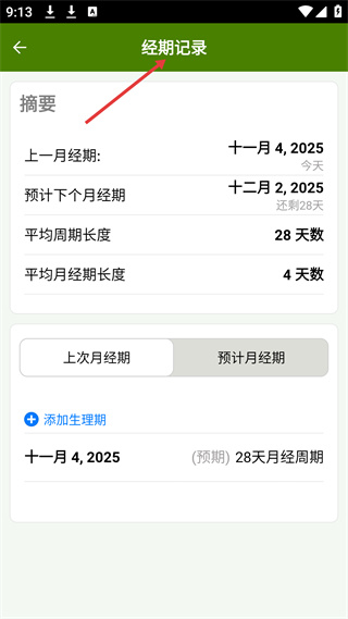 3、經期記錄界面,展示上一月經期、預計下一月經期等摘要信息,可添加生理期記錄,幫助用戶跟蹤經期時間。