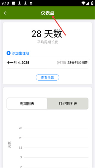 4、儀表盤界面顯示平均周期長度,有周期圖表等板塊,可查看全部經期數據,提供經期數據可視化管理。