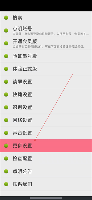 1、打開點明安卓軟件進入設置頁面,找到更多設置選項,點擊進入更多設置列表,瀏覽其中包含的各類細分設置項。