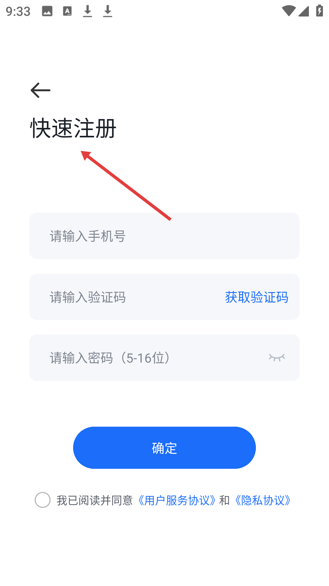 2、快速注冊頁面需輸入手機號、獲取并填寫驗證碼設置5、16位密碼,同意協議后點擊確定完成注冊。