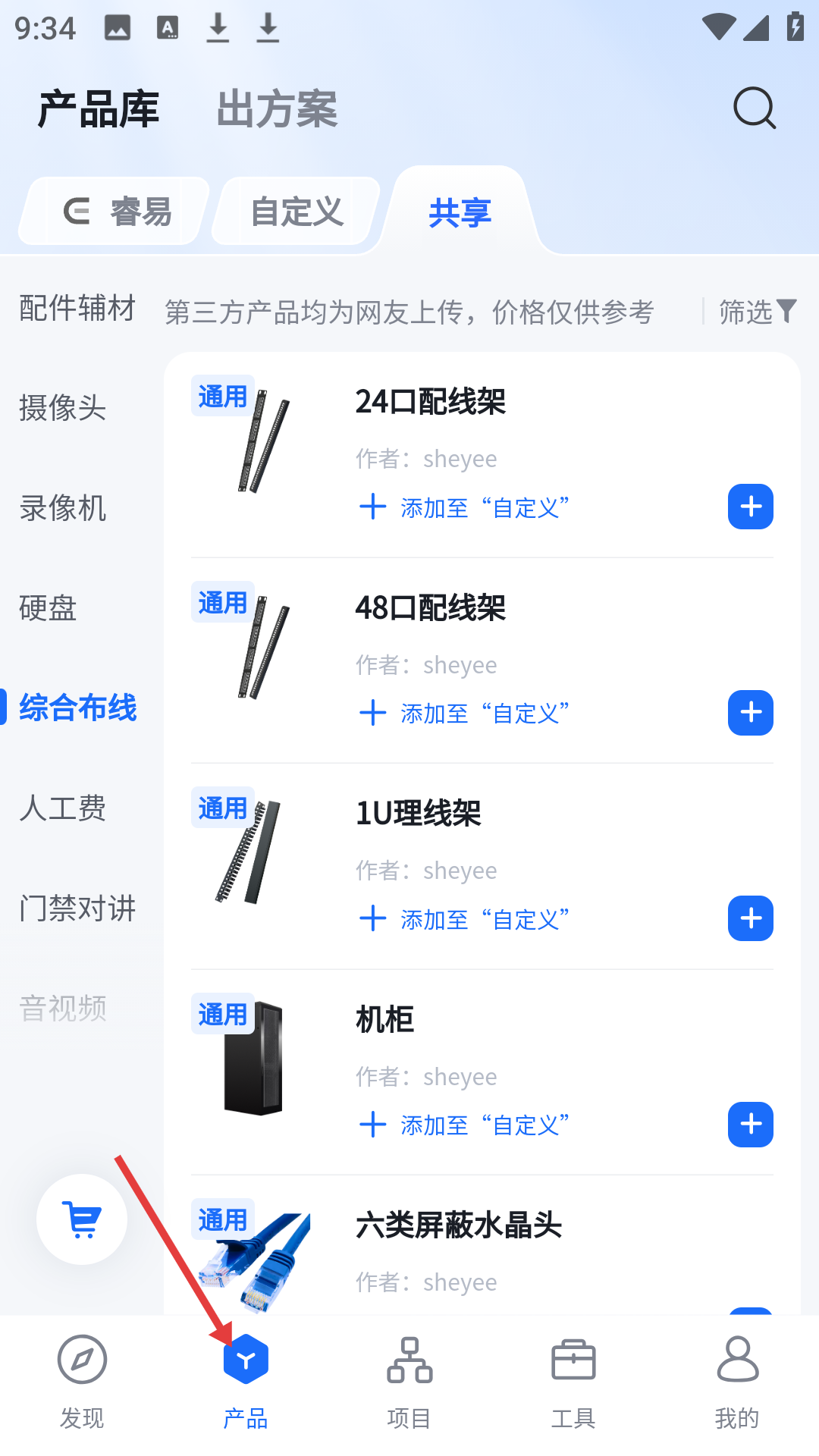 3、產品庫共享板塊,展示綜合布線類產品,如24口配線架、機柜等,第三方產品價格供參考,可添加至自定義。
