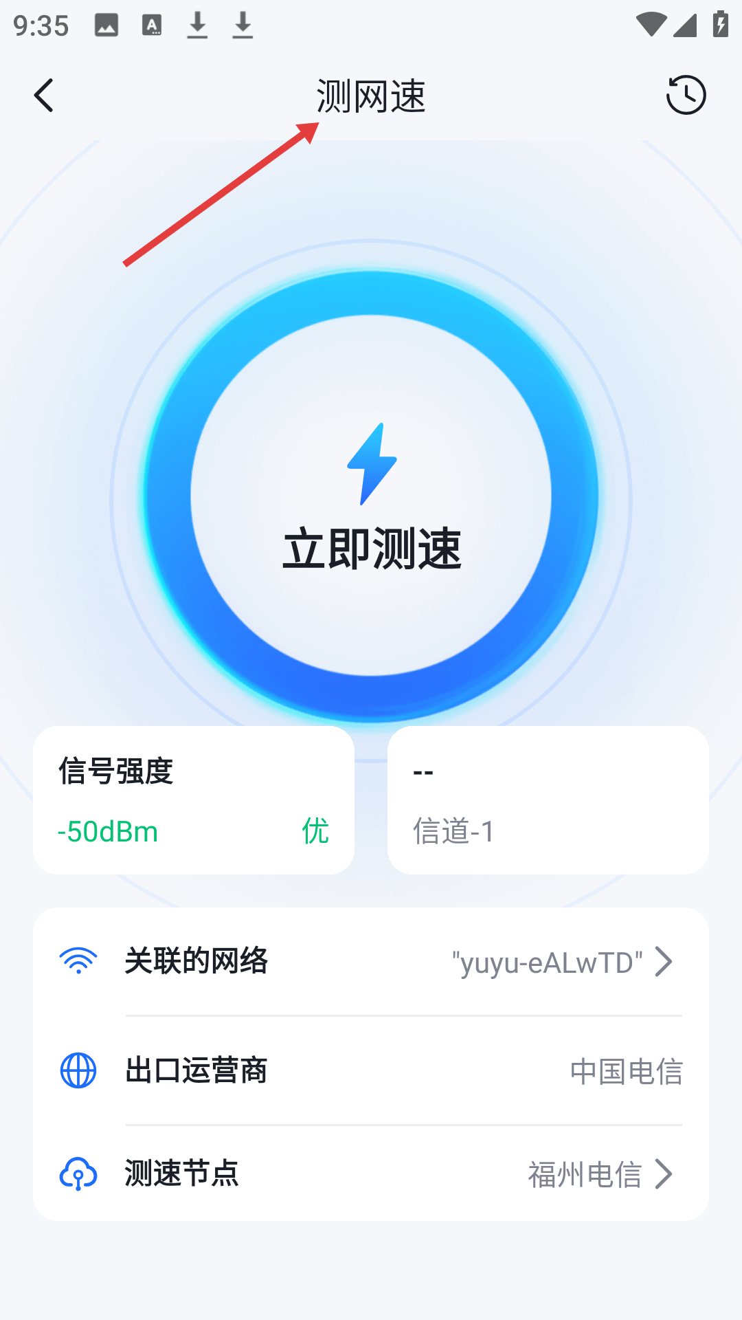 4、測網速功能頁,可點擊立即測速,顯示信號強度、關聯網絡、出口運營商等信息,助力了解網絡狀況。