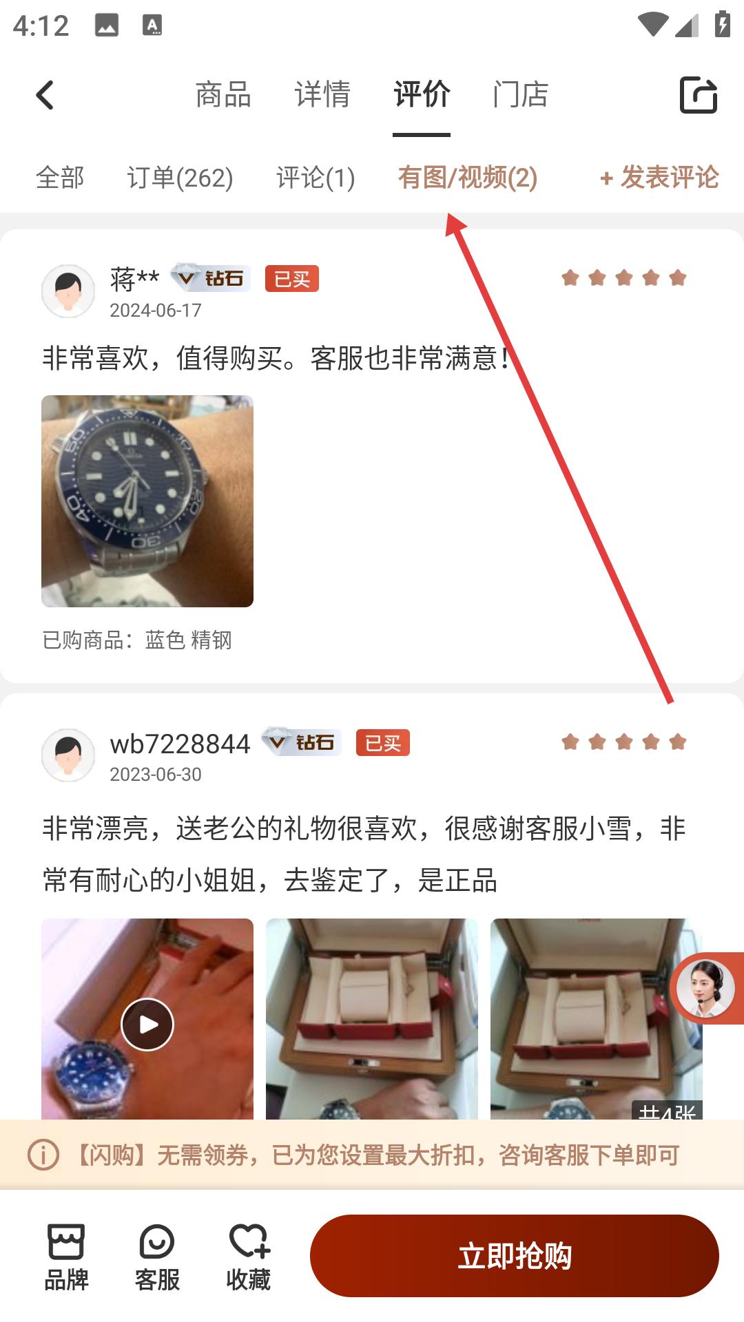 3、在腕表詳情頁面點擊評價選項,進入評價頁面,查看其他買家的評論,包括有圖,視頻的評價,了解大家對這款腕表的使用感受。