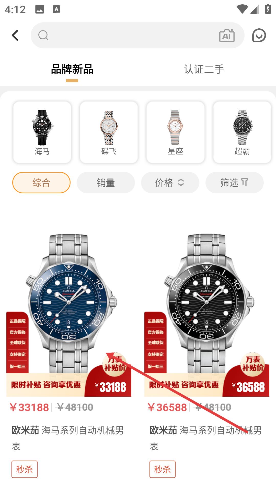 1、進入品牌新品頁面,可看到海馬、碟飛等系列腕表,還能按綜合、銷量、價格等排序,挑選心儀的歐米茄海馬系列自動機械男表。