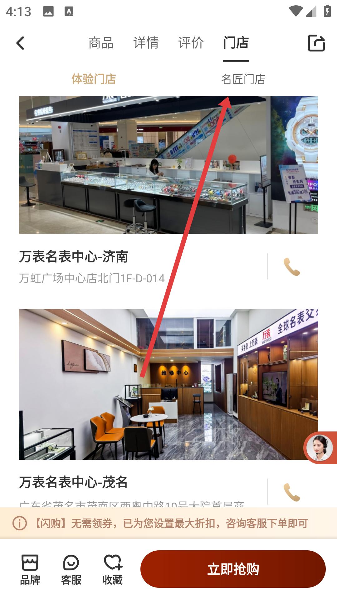 4、看完評價后,點擊門店選項,進入門店頁面,查看體驗門店和名匠門店的相關信息,如萬表名表中心在濟南、茂名等地的門店地址等。