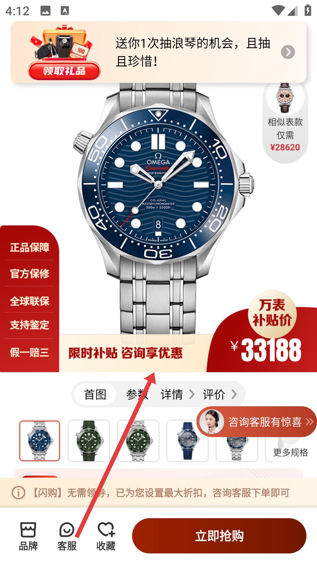 2、選中一款歐米茄海馬系列自動機械男表后,進入該腕表詳情頁面,查看腕表的圖片、價格、正品保障等信息,了解限時補貼活動。