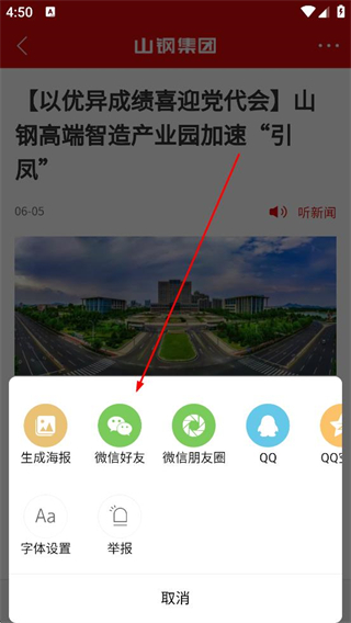 4、在分享選項中選擇微信渠道,完成操作將新聞分享出去,也可選擇生成海報或調整字體樣式等功能。