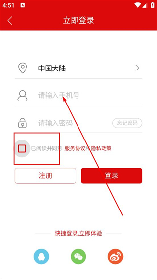 1、打開厚道山鋼app進入立即登錄頁面,選擇地區為中國大陸,輸入手機號和密碼,勾選協議后點擊登錄按鈕完成登錄。
