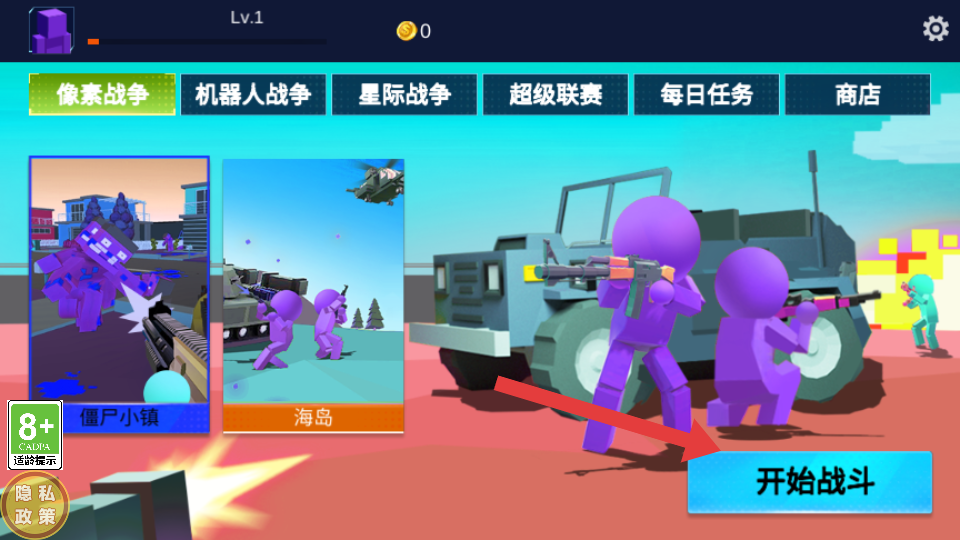 1、進入游戲,選擇像素戰爭模式,點擊開始戰斗,進入裝備搭配界面,準備挑選合適的武器和配件。