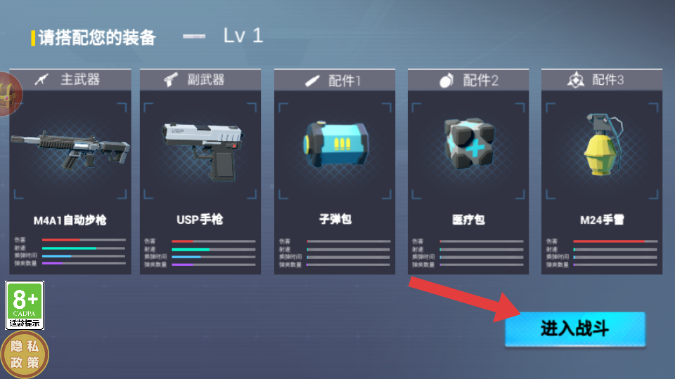 2、在裝備搭配界面,選擇主武器、副武器以及各類配件,搭配好后,點擊進入戰斗,開啟戰斗征程。