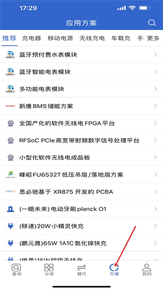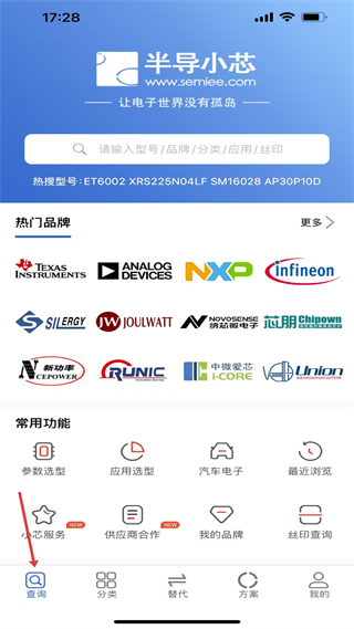 1、查詢頁、可搜索芯片型號、品牌等,展示熱門品牌如德州儀器等,有參數選型、汽車電子等常用功能。