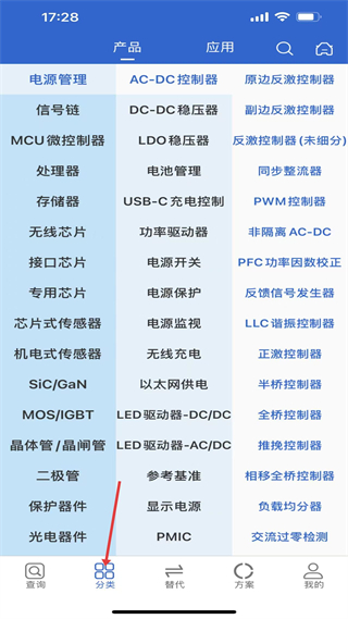 2、分類頁、產品分類詳細,涵蓋電源管理、信號鏈、MCU微控制器等多領域,便于用戶按類別查找芯片。