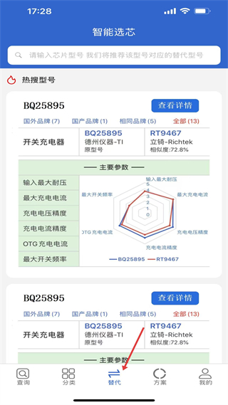 3、替代頁、提供智能選芯服務,可輸入芯片型號查詢替代型號,如BQ25895的替代型號RT9467,還展示主要參數對比。