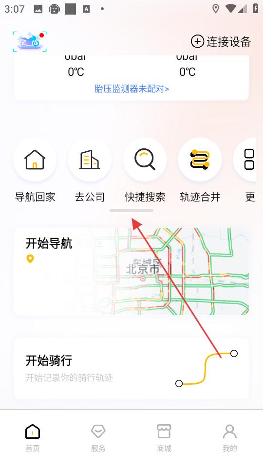 1、進入首頁找到快捷搜索圖標,點擊進入搜索頁面,可查找目的地、騎行路線等信息,滿足出行導航需求。
