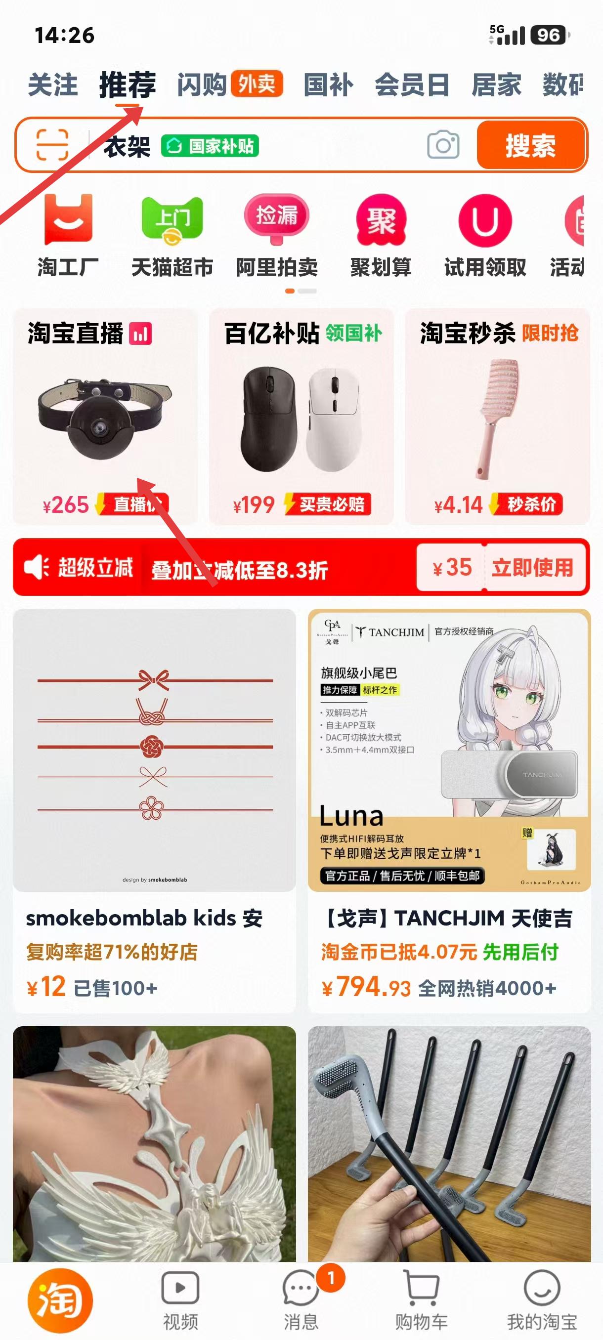 1、首頁布局豐富設關注、推薦、閃購等頻道,搜索欄支持精準查找,淘工廠、天貓超市等入口便捷,淘寶直播、百億補貼模塊陳列優惠商品,超級立減活動疊加折扣。