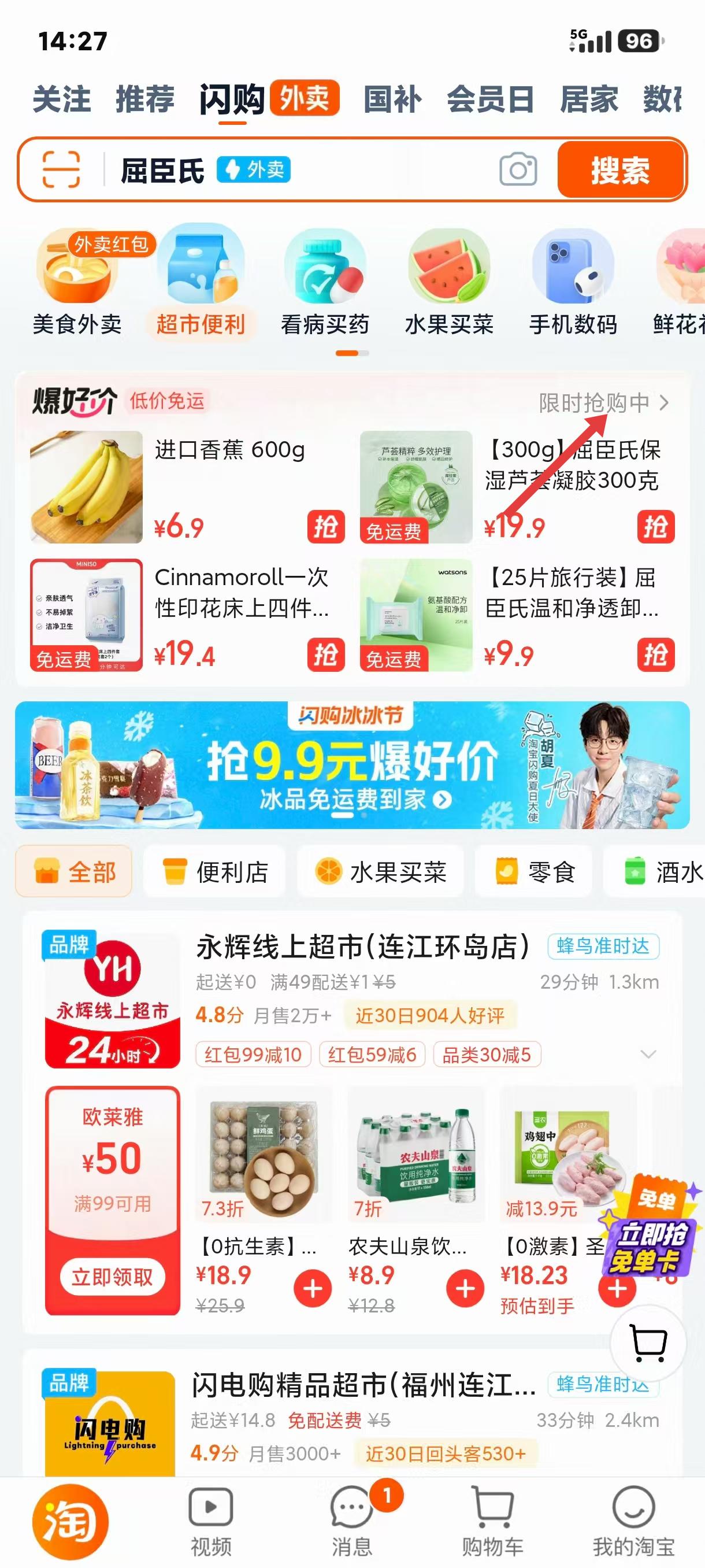 2、閃購外賣頻道聚合美食、超市、看病買藥等分類,爆好價專區推低價免運商品,閃購冰冰節冰品,永輝等超市展折扣好物,滿減紅包搭配蜂鳥配送。