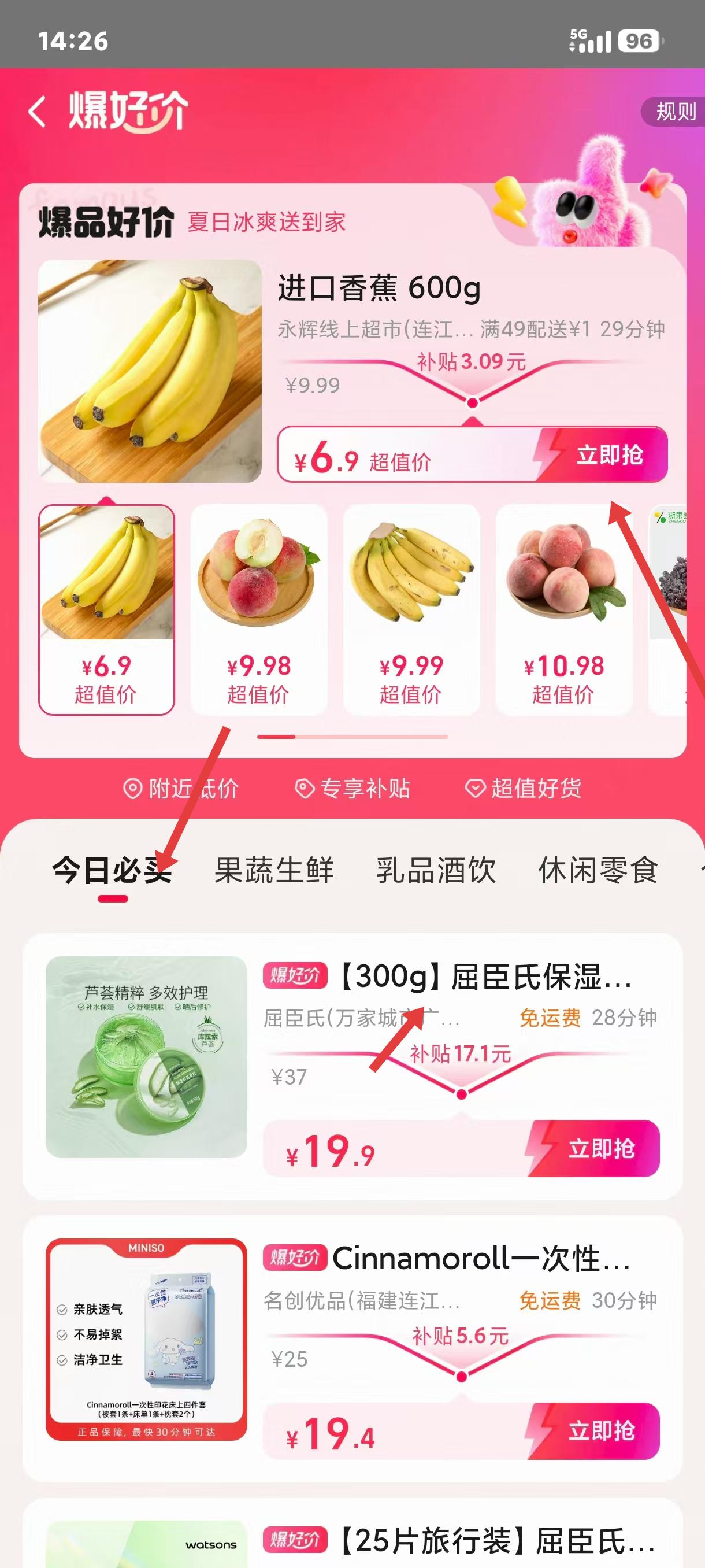 3、爆好價頁面進口香蕉等生鮮百貨標超值價,補貼金額直觀呈現,今日必買、果蔬生鮮等分類導航,屈臣氏蘆薈膠等商品享免運費。