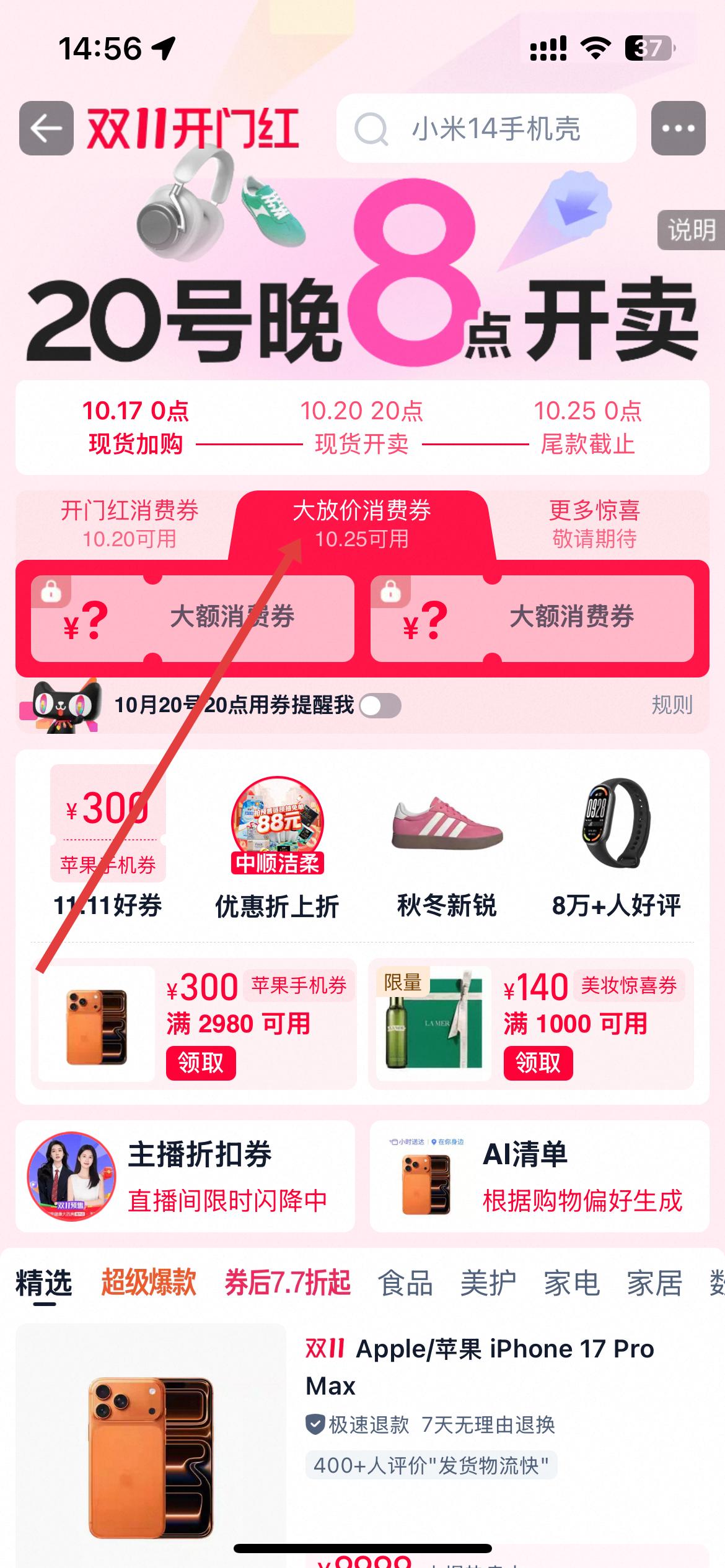 3、頁面顯示20號晚8點開賣,還有十月二十五日可用的大放價消費券等后續優惠,可提前了解活動節奏。