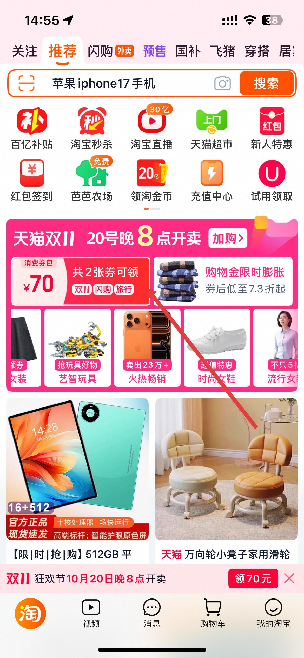 1、進入淘寶主界面,能看到搜索欄及百億補貼、淘寶秒殺等功能入口,還有天貓雙11 20號晚8點開賣的活動提示,可開啟購物之旅。