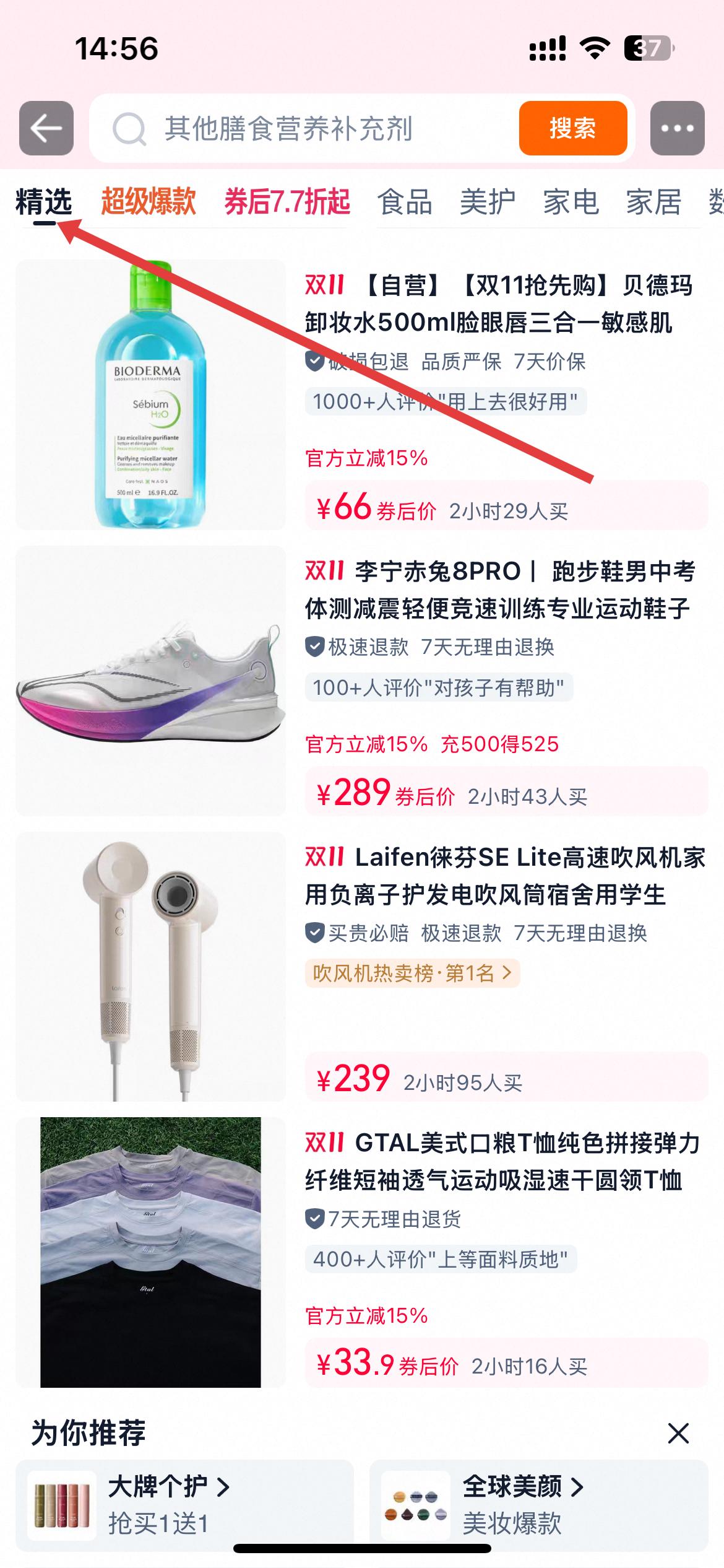 4、商品展示區域,有精選、超級爆款等分類,能看到貝德瑪卸妝水、李寧跑鞋等各類商品,方便挑選心儀物品。