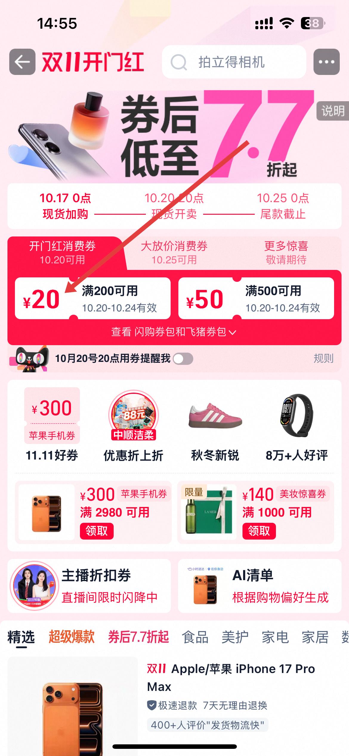2、雙11開門紅頁面,有券后低至七點七折起的活動,可領取滿200可用的20元等消費券,助力購物優惠。