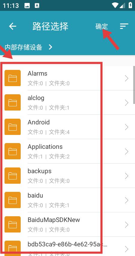 3、路徑選擇頁面羅列內部存儲的多個文件夾,Alarms、Android等目錄清晰,右上角確定按鈕,幫助用戶選定下載文件的存儲路徑。