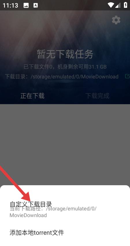 2、設置菜單彈出自定義下載目錄選項顯示當前路徑,同時提供添加本地torrent文件功能,引導用戶靈活設置下載存儲位置。