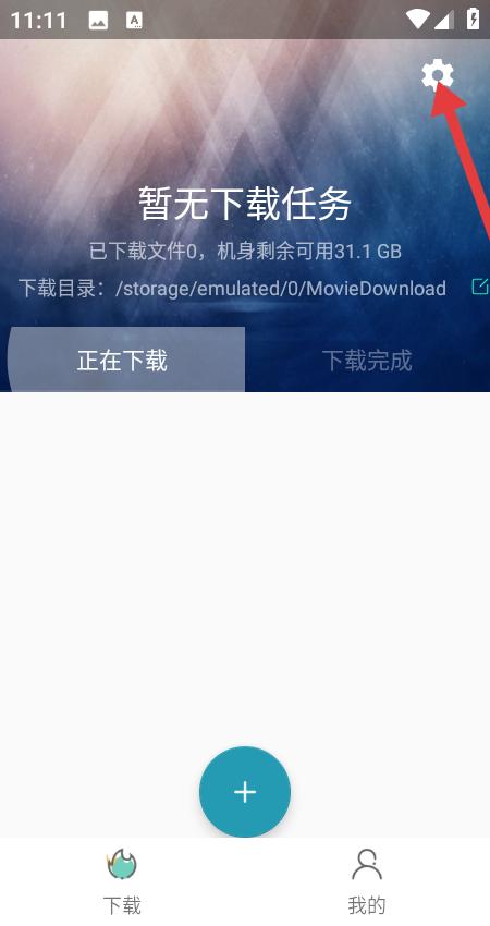 1、下載界面顯示暫無下載任務機身剩余空間清晰,右上角齒輪圖標可進入設置,底部加號按鈕方便添加新任務,簡潔布局助力用戶管理。