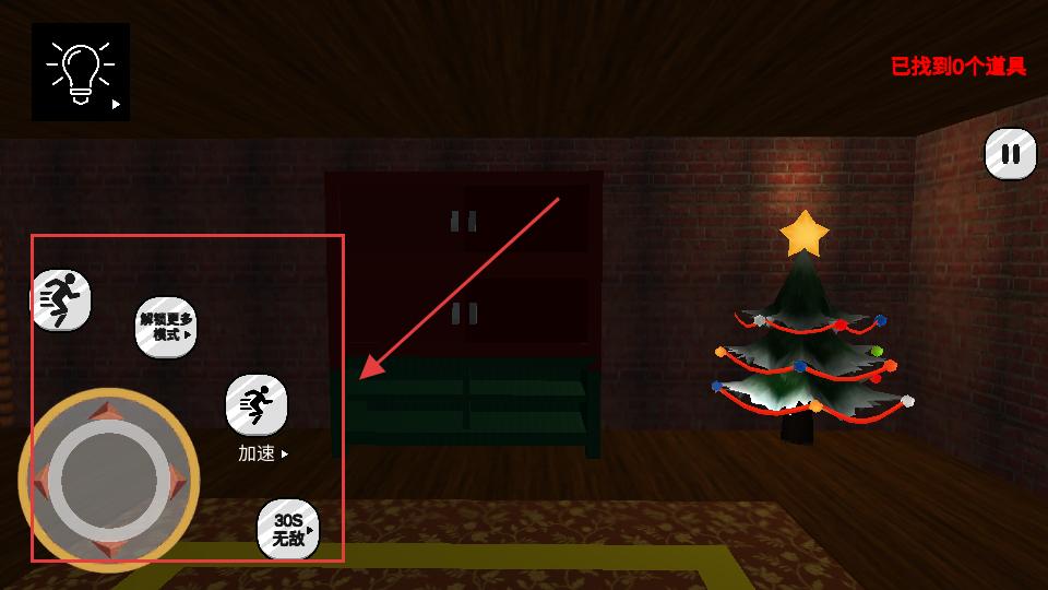 3、進入游戲場景后使用左側的方向控制和功能按鈕,操控角色在場景中移動,探索房間內的柜子、圣誕樹等區域,尋找道具,同時留意右上角的道具。