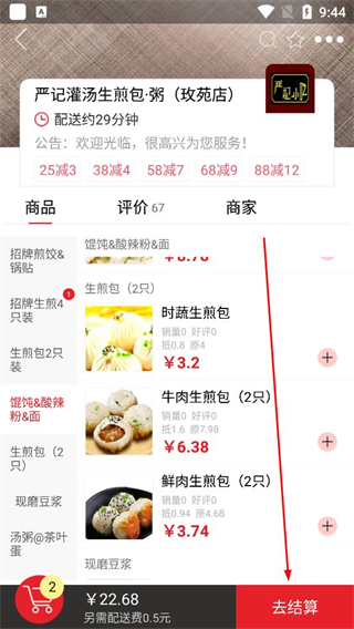 1、進入軟件首頁,瀏覽附近商家列表,選擇嚴記灌湯生煎包粥店,點擊進入該商家的商品頁面,準備挑選所需餐品。