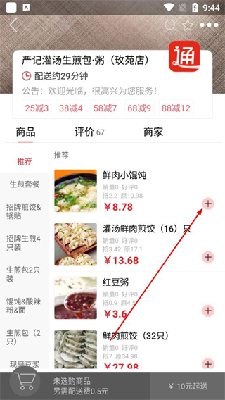 2、在商家商品頁選擇推薦分類下的鮮肉小餛飩,點擊對應的加號按鈕,將該餐品添加到購物車中繼續挑選其他餐品。