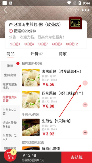 3、切換到招牌生煎4只裝分類選擇素味煎包等餐品,點擊加號按鈕添加到購物車,查看已選商品的價格及優惠信息。