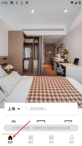 1、租房頁上海,可搜索租房區域,打開定位權限能獲精準推薦,頁面展示公寓室內圖,方便找心儀房源。