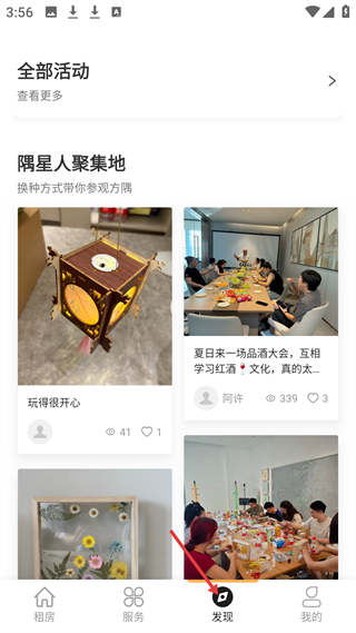 3、發現頁有全部活動和隅星人聚集地板塊,展示燈籠制作、品酒大會等活動,可了解方隅公寓社群動態。