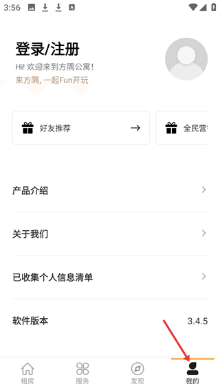 4、我的頁可登錄注冊,有好友推薦、全民營銷等活動入口,還能查看產品介紹、關于我們等信息了解公寓詳情。