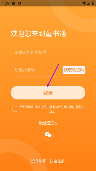 1、童書通登錄界面支持手機號驗證碼及微信登錄,需同意相關協議,無賬號可快速注冊,是進入應用的基礎入口。