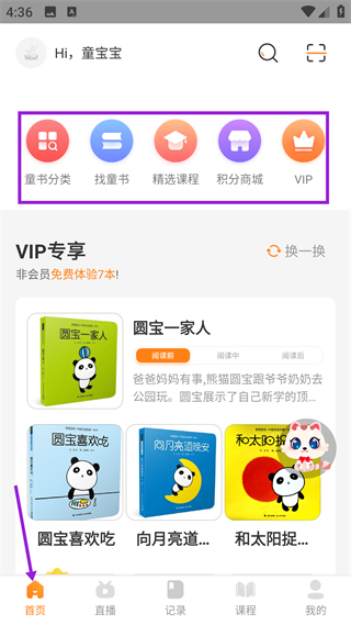 2、首頁設童書分類等功能,有VIP專享童書區,非會員可免費體驗7本,助力兒童便捷獲取適配的閱讀資源。